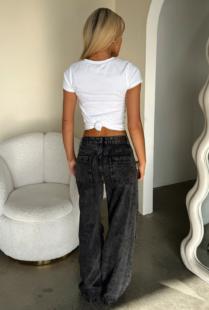 Dare to make a statement with Adalia Jeans. These bold, black denim jeans feature cargo style pockets, belt loops around the waist, mid rise, and a baggy wide leg fit, so you can look your best. Prepare to turn heads and be the trendsetter you are! Match her with a White Cropped Tee for a cool and edgy look.
