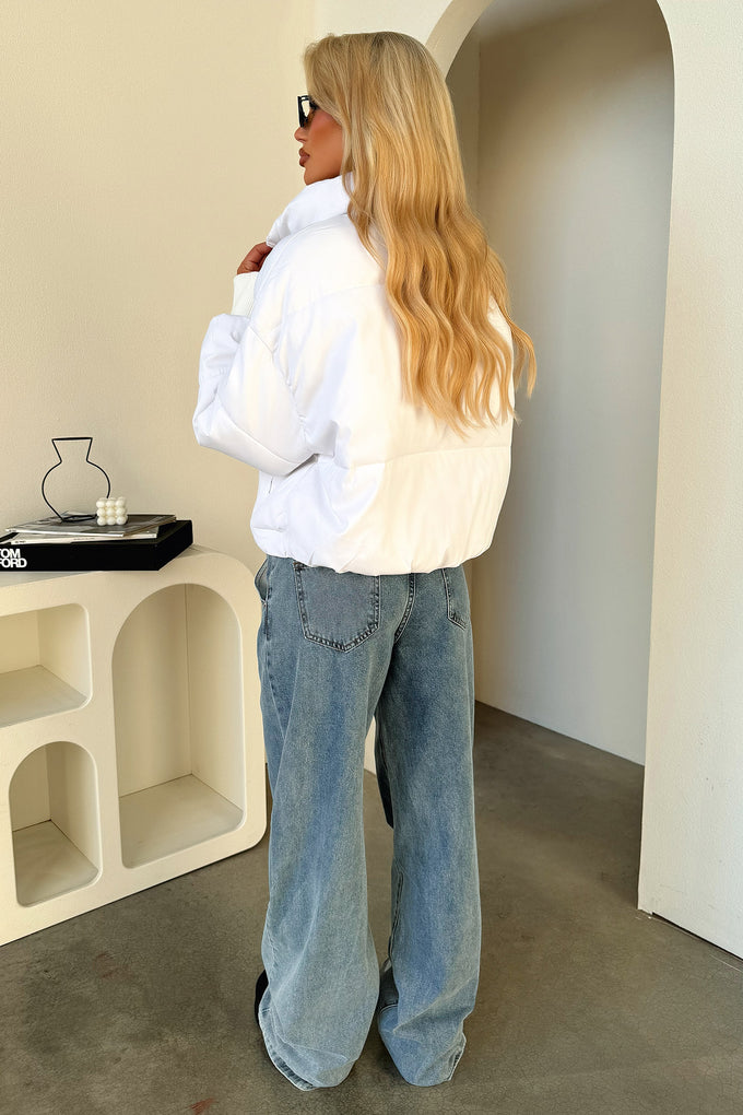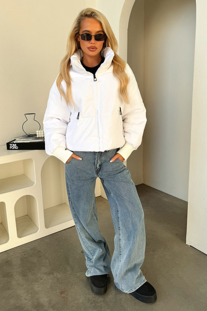 Keepin' you cozy this winter! The Ajax Puffer offers a super soft and comfy puffer material, long sleeves with cuffed ribbed ends, a high neck collar, zip up front and two front pockets. Style her with a pair of flares and a basic black crop.