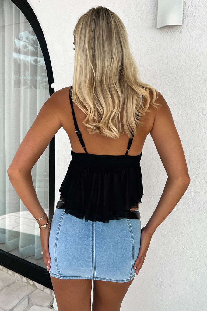 Sweet like sugar! The Alaria Crop offers lace detailing along the neckline, adjustable straps, double lining at the bust, mesh material and a loose frilly fit design. Match her with a denim skirt and sneakers for a cute look.