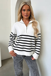 Stay cozy and stylish with our Anderson 3/4 Zip Knit. Made from soft knitted material, this top features cuffed sleeves and a silver zip for a touch of shine. The black and white stripes add a classic touch, making it perfect to pair with jeans and sneakers. Don't sacrifice comfort for style!