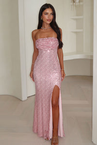 The Annita Maxi Dress is the perfect blend of elegance and fun. Made with shimmering sequin fabric and featuring a leg split, this strapless dress is fully lined and includes an invisible zip with a hook and eye closure for a seamless fit. The silicone tape on the inside of the neckline ensures you can dance all night long without any wardrobe malfunctions. Pair with heels and gold jewellery for a stunning look!
