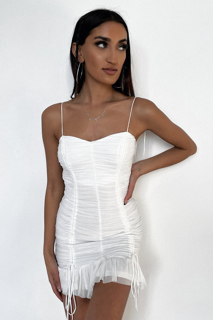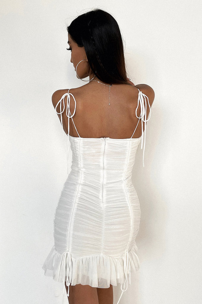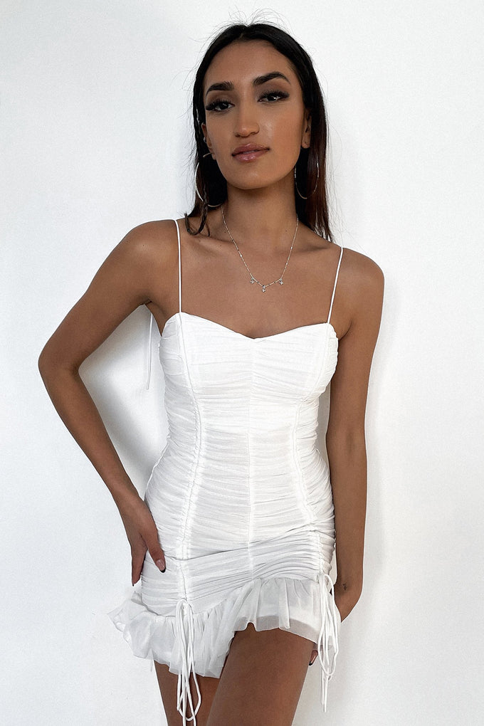 You'll have all eyes on you when you put this lil hottie on! The bodycon babe showcases overall ruching, a ruffled style bottom edge with tie up ruching, an invisible back zipper, tie up spaghetti straps and a v style neckline. Wear her out paired with some black strappy heels and silver jewellery.