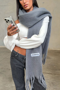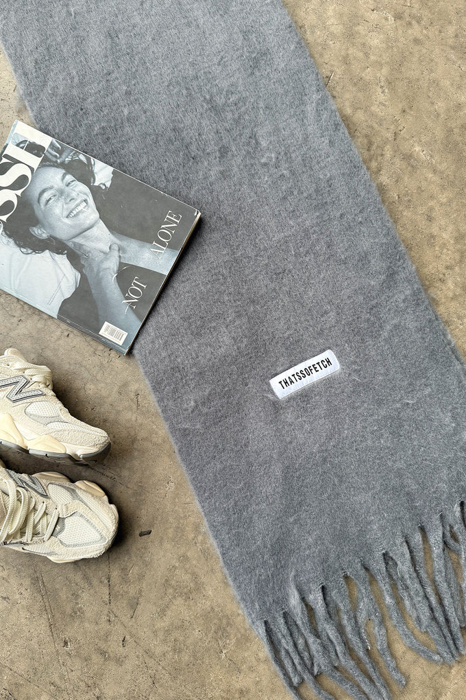 Get cozy this winter with the Cinzia Scarf. Made from soft and fluffy wool, this scarf features trendy tassel detailing and an embroidered patch that reads "THATSSOFETCH". Keep stylish and warm this season!