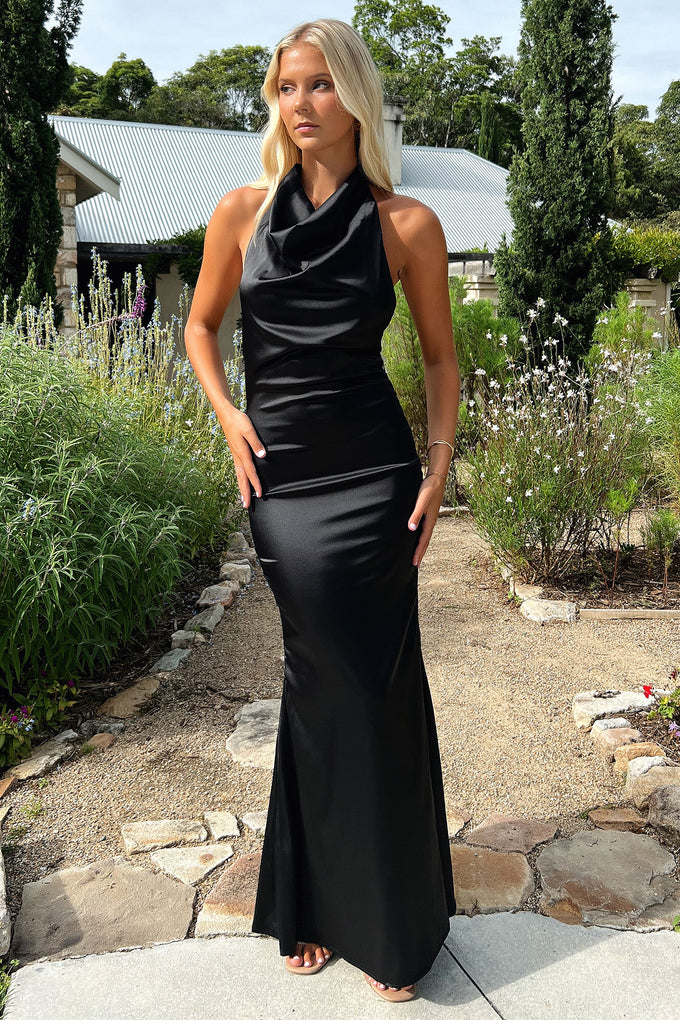 Step into the spotlight with our Corwin Maxi Dress. This elegant and flirty dress features a satin material, halter neck, and high neckline for a sleek look. The open back, train detailing and button neck closure add a touch of fun and sophistication. Perfect for weddings, pair with heels and a small bag for a show-stopping look!