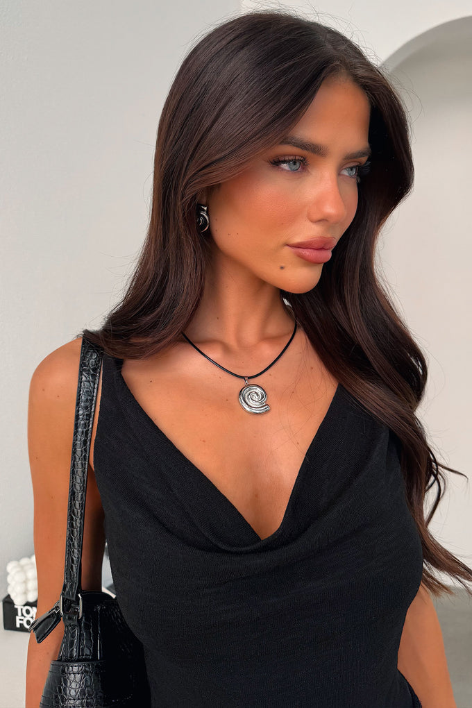The Cove Necklace - Gold is the perfect accessory for your next tropical holiday. The delicate shell design adds a touch of beachy charm, while the black rope chain allows for an adjustable length. Pair it with a cute crop and maxi skirt for a stylish and playful look!