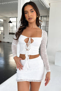 Get ready to party in the Festa Skirt! Made with delicate floral lace, this bodycon skirt is designed with double lining and flirty ruffle details. Complete the look with the matching long sleeve crop for a night to remember!