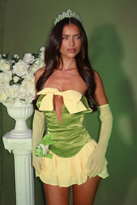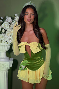 This playful three-piece set features a strapless satin top with a flattering V neckline and boning, highlighting a gathered bust adorned with a big yellow bow trimmed in silver glitter. The lace-up back ensures a perfect fit. The low-rise mini skirt has a thick gathered waistband and layered design with an invisible side zip and hook closure for a seamless look. Complete your outfit with elbow-length yellow mesh glittery gloves. For extra magic, pair it with the green princess tiara and the Kiss The Fro accessory for a truly enchanting style!