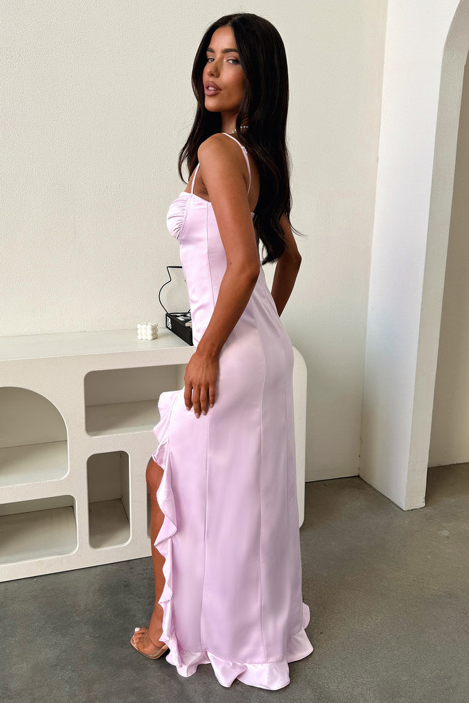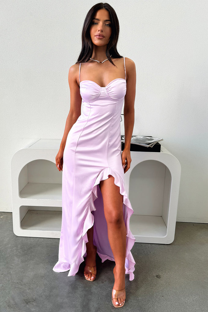 Lauren Ruffle Trim Satin Maxi Dress - Lilac