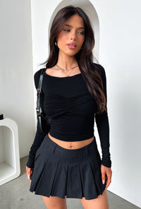 Be bold and effortlessly stylish with the Laurie Top. Featuring long sleeves, a boat neckline, and soft material, this top is perfect for a casual look. The bust detailing and ruching add a touch of playfulness. Pair with jeans and sneakers for an easy and chic outfit. Get ready to turn heads!