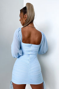 Stand out in the crowd in the Lorde Dress in Blue. This babe features an all over ruched fabrication with tie up detail on each side of the dress, off the shoulder, sheer long long sleeves and is completed with invisible back zipper. She looks amazing when paired with your go to nude heels and gold jewellery.
