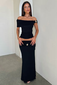 The Malika Off-Shoulder Top in Black is your new go-to for effortless glam! Featuring a fold-over off-shoulder neckline, ruched sides, and a soft stretchy fabric that hugs in all the right places, this flattering silhouette is finished with luxe gold shoulder detailing for an elevated touch. Pair it with the matching maxi skirt for a sleek, coordinated look perfect for your next night out!