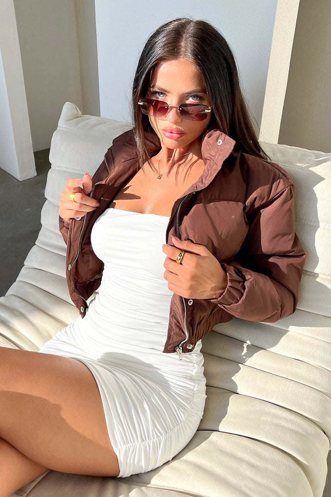 Layer up this winter in the cosiest jacket ever! The Manchester Puffer in Brown features a cropped fit with an elasticated waistband, a high neck style with a zip and snap button closure, cuffed sleeves and a thick puffy fabrication all over. Take this babe on a winter night out paired with white high waisted jeans, a cute crop and some boots.
