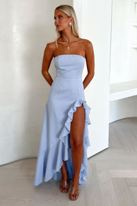 Get ready to turn heads in our Milford Maxi Dress! Featuring a strapless design and frill detailing, this dress also has boning on the sides to keep the bust in place. The ribbon tie back adds a cute touch, while the invisible back zip and hook and eye closure provide convenience. With a lined interior and silicone tape on the inside of the neckline, this dress is both stylish and comfortable. Complete the look with heels and gold jewellery for a stunning ensemble!