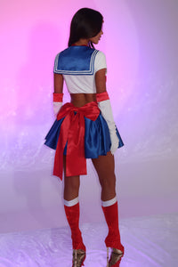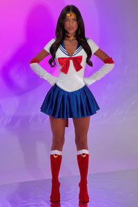 This playful two-piece set features a soft mini dress with a sailor-style collar and a charming bow on the front! The double-lined design ensures comfort, while the open back adds a flirty touch. A pleated skirt flows effortlessly, complemented by a big detachable red bow, an invisible back zip and a snap button bodysuit inside for a perfect fit. This set also includes white and red elbow length gloves made with soft stretchy fabric. Complete your look by pairing it with matching accessories and boots for a fun, stylish vibe!