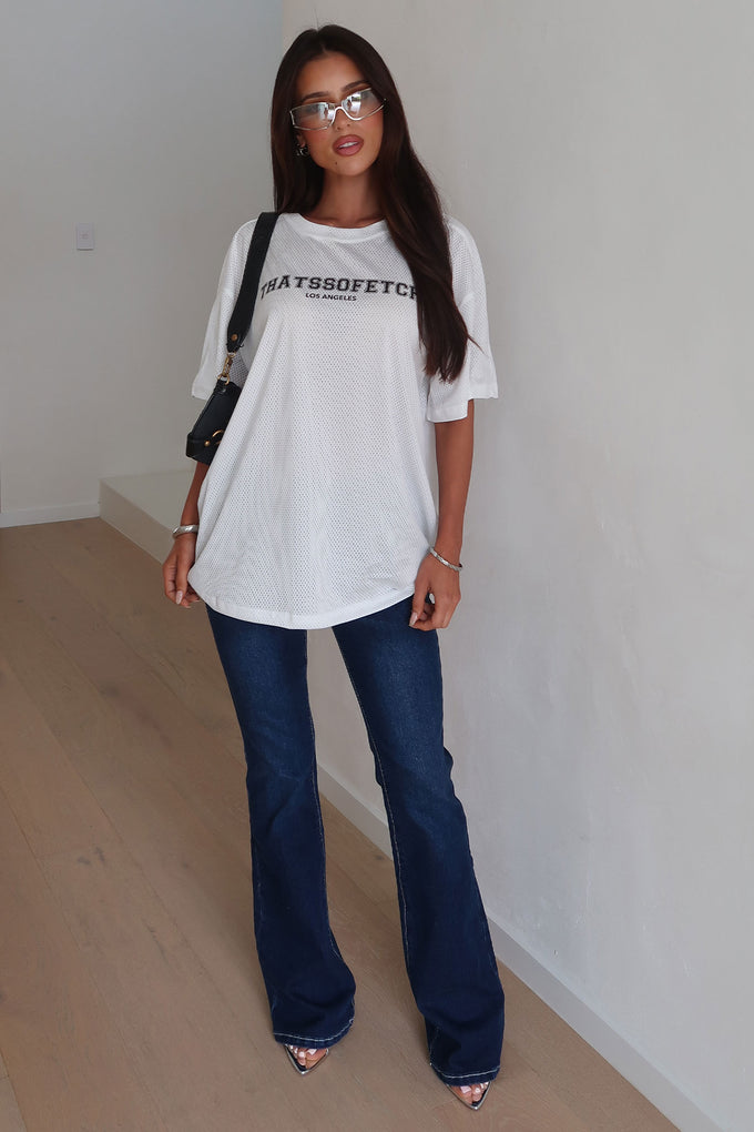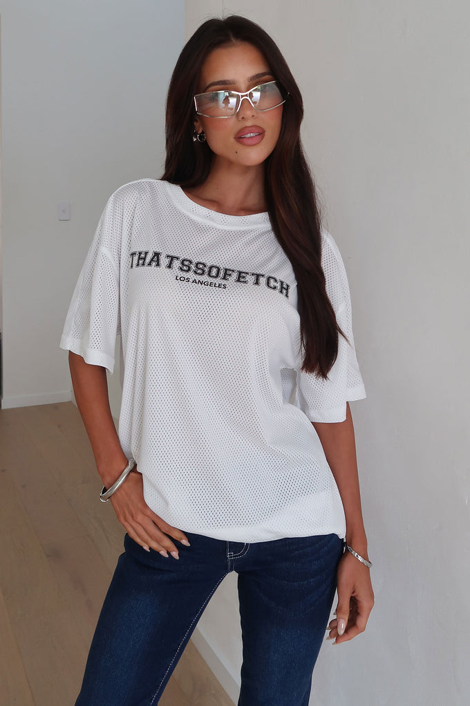 Get ready to stand out in the Offside Tee - White, featuring a comfy jersey style and a flattering round neckline! With its oversized fit and bold Thats So Fetch logo on front and back, this tee brings effortless cool to your concert look. Pair it with jeans and a cute bag for a playful vibe that’s as fun as the night ahead!