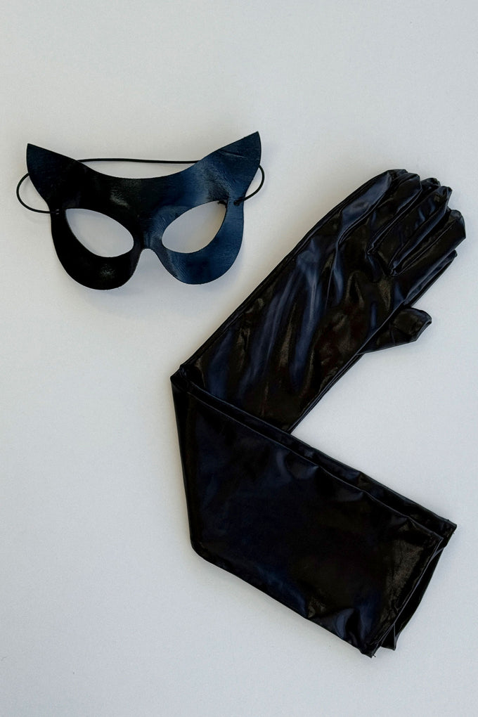 Get ready to turn heads with the On the Prowl 2 Piece Accessory Kit! This playful set includes a sleek cat eye mask with a stretchy elastic strap for a perfect fit, paired with chic elbow-length leather gloves. Team it up with the On the Prowl playsuit to complete your bold, irresistible look!