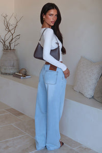 These Ravika Low Rise Jeans in blue bring effortless style with a playful twist! Featuring a no waistband design and secure hook, bar, and zip closure, they offer a sleek fit without extra bulk. Four functional pockets add practicality, while a ThatsSoFetch leather patch gives a trendy touch. Their wide leg silhouette keeps things cool and comfy, perfect to pair with a cute singlet and sneakers for a laid-back, stylish look!