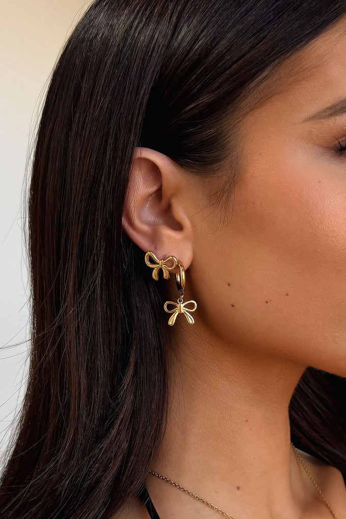 The Rubi Earrings 2 Pack - Gold is the perfect addition to your summer accessory collection. With a cute stud featuring bow details and a hoop with a bow, these earrings are a must-have. Stack them with your favorite gold pieces for the ultimate stylish look!