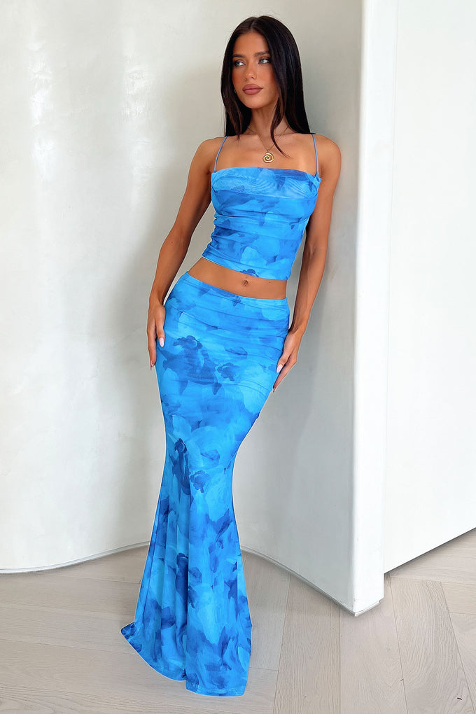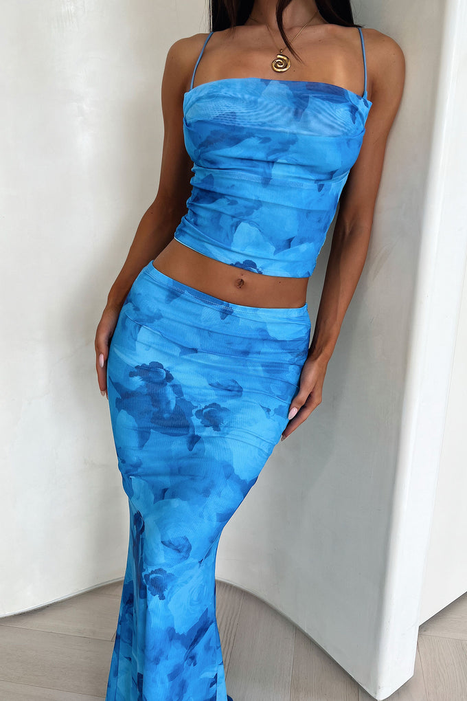 Get ready to turn heads with our Ryleigh Crop! This crop top features a beautiful floral print, a flirty cowl neckline, and adjustable thin straps. Made from stretchy material and lined bust for a comfortable and flattering fit. Perfectly paired with our matching maxi skirt and white heels for a night out!