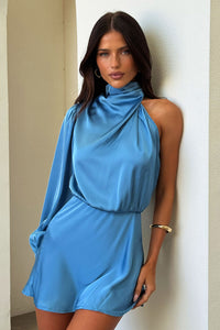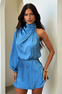 Sophisticated and classy! The Santorini One Shoulder features a high neckline with a button closure at the back, one shoulder design with a balloon sleeve and cuffed ends, an A-line fit and a cut out detail at the back with an invisible zipper. Match her with Black heels and some hoops for an evening out.