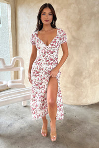 The prettiest dress for a cute Sunday brunch date! This beauty offers a sweetheart neckline, short puffy sleeves with frilled edges, buttons down the front, double lined bust, shirred material across the back, an invisible side zipper, a flowy fit and a cheeky side slit. Style her with Your go to flats, a little tote and some sunnies.