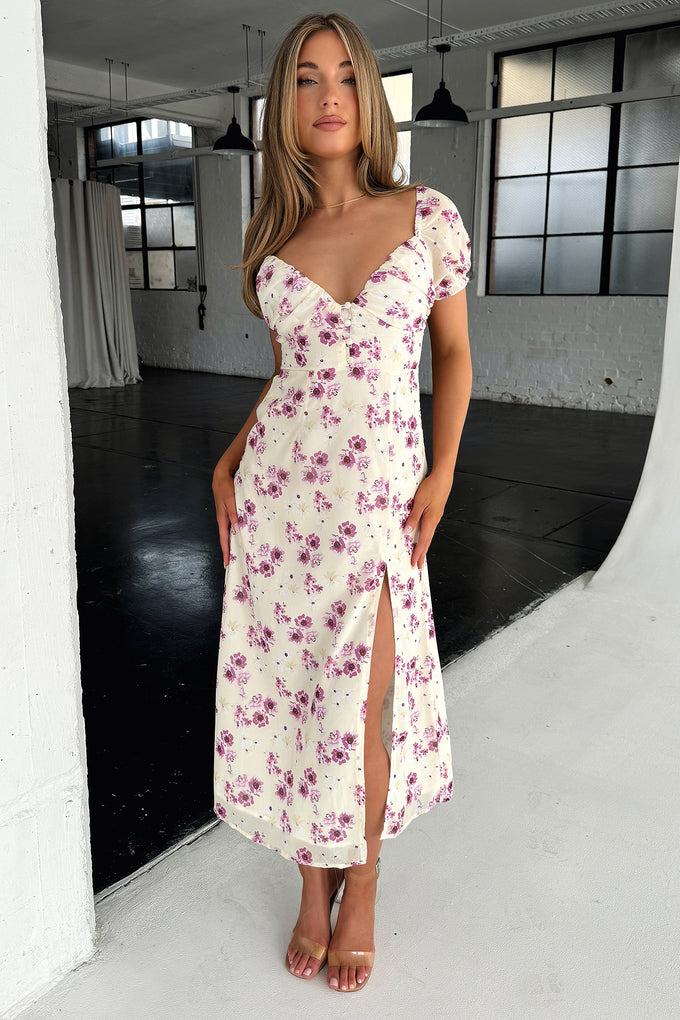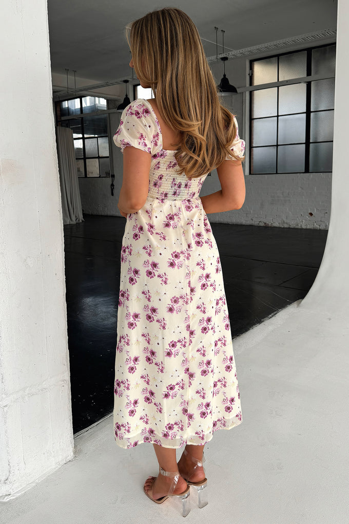The prettiest dress for a cute Sunday brunch date! This beauty offers a sweetheart neckline, short puffy sleeves with frilled edges, buttons down the front, double lining, shirred material across the back, an invisible side zipper, a flowy fit and a cheeky side slit. Style her with Your go to flats, a little tote and some sunnies.