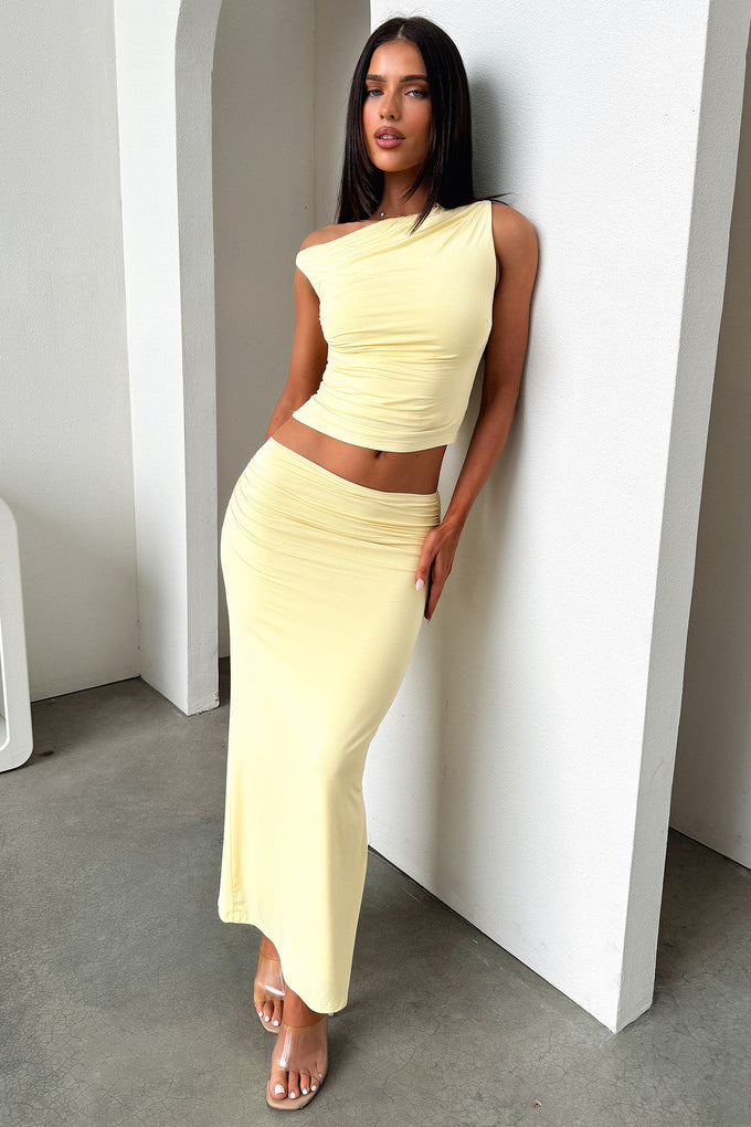 Turn heads this season in this stunning Vamika Maxi Skirt. This fun and flirty piece makes a statement with its body-con fit, double lining, and ruched sides. With an elasticated waistband and low-rise cut, this piece is sure to make your summer wardrobe scorching hot. Match her with the Vamika Top for a wild combo that'll get 'em looking!