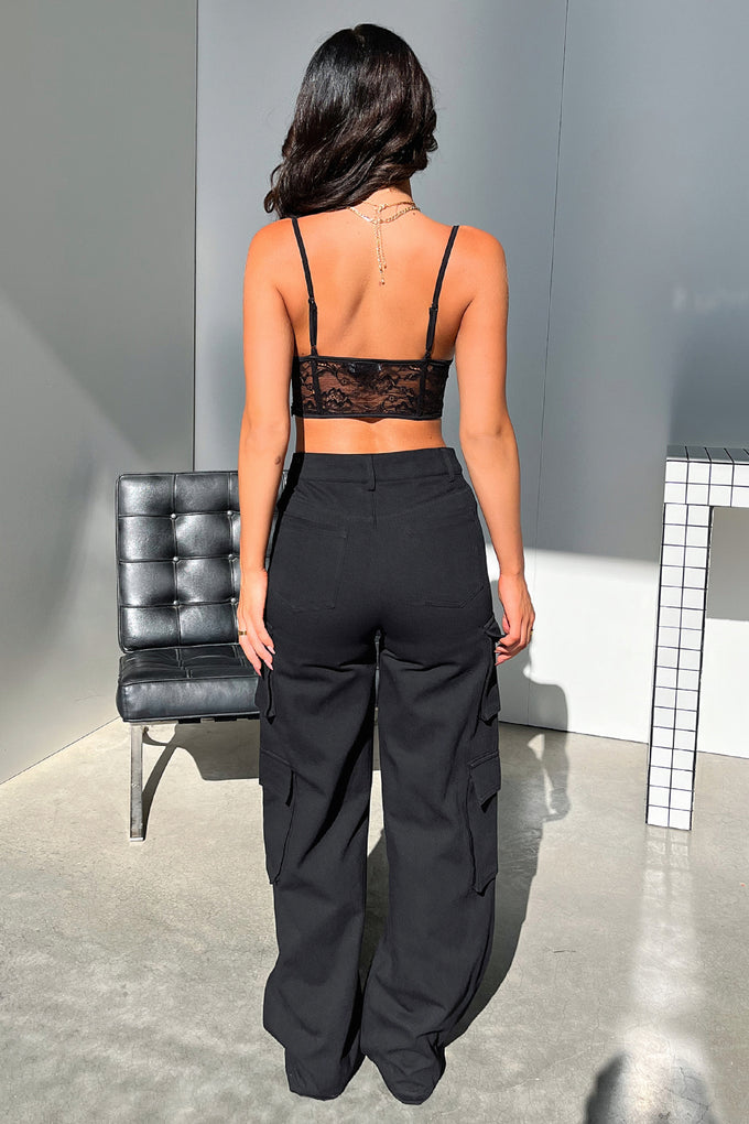 Walk in with style wearing the latest Venus Cargo Pants! She features a wide leg fit with functioning cargo style pockets along with 2 front and back pockets a silver zipper + button closure at the centre and belt loops around the waist. Match her with a white baby tee and sneaks for an easy but hot look.