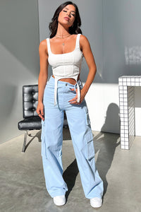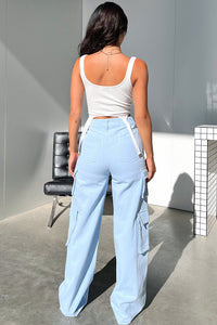 Walk in with style wearing the latest Venus Cargo Pants! She features a wide leg fit with functioning cargo style pockets along with 2 front and back pockets a silver zipper + button closure at the centre and belt loops around the waist. Match her with a white baby tee and sneaks for an easy but hot look.