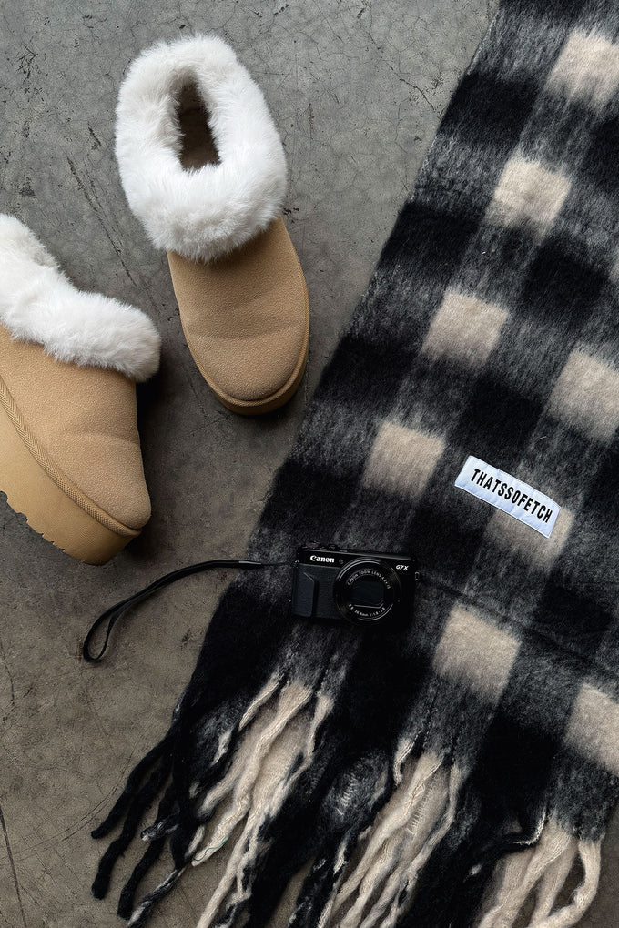 Get cozy this winter with the Zoeino Scarf! Made from soft and fluffy wool, this scarf features trendy tassel detailing, plaid print and an embroidered patch that reads "THATSSOFETCH". Keep stylish and warm this season!