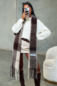 Get cozy this winter with the Zoeino Scarf! Made from soft and fluffy wool, this scarf features trendy tassel detailing, plaid print and an embroidered patch that reads "THATSSOFETCH". Keep stylish and warm this season!